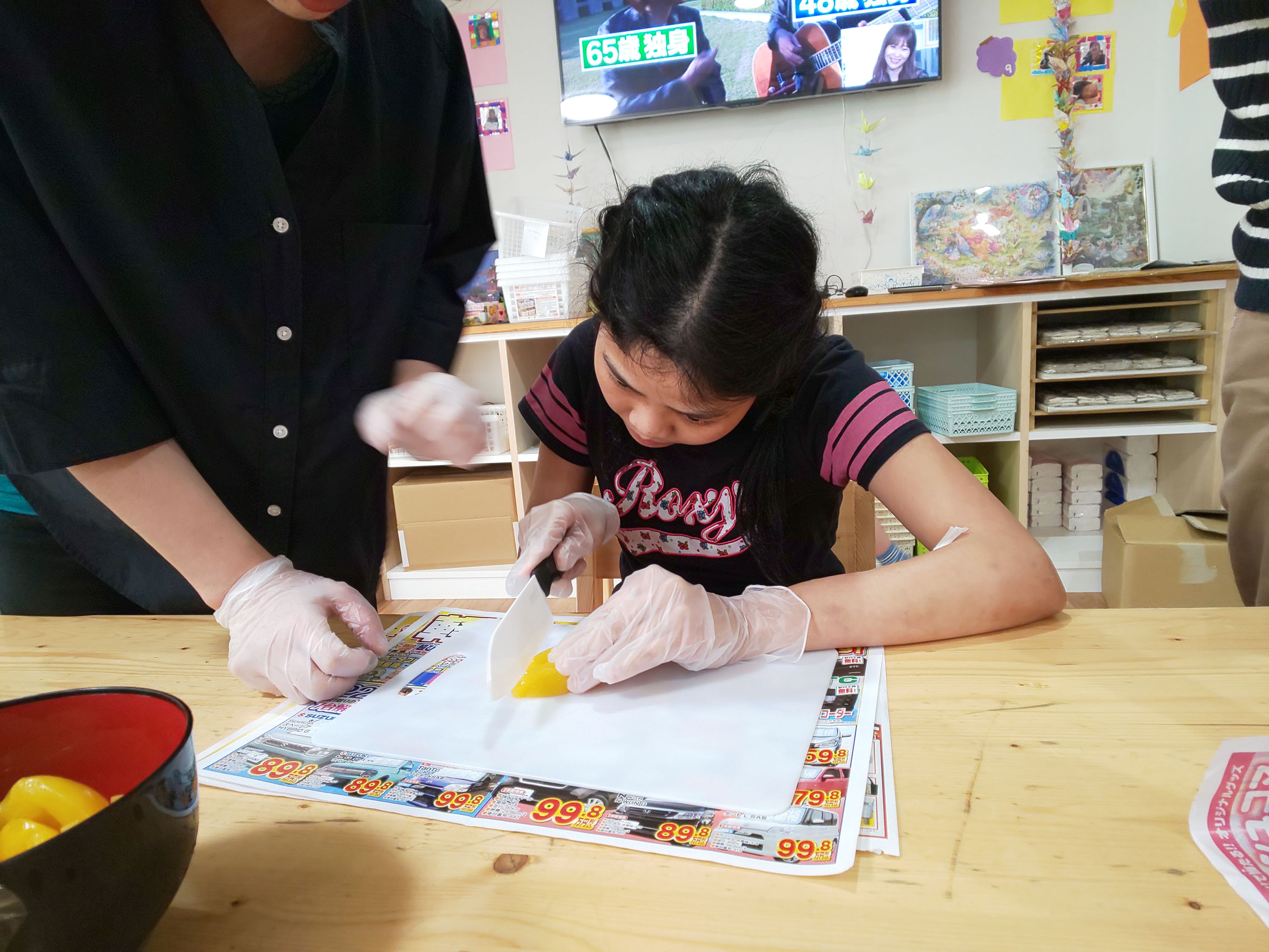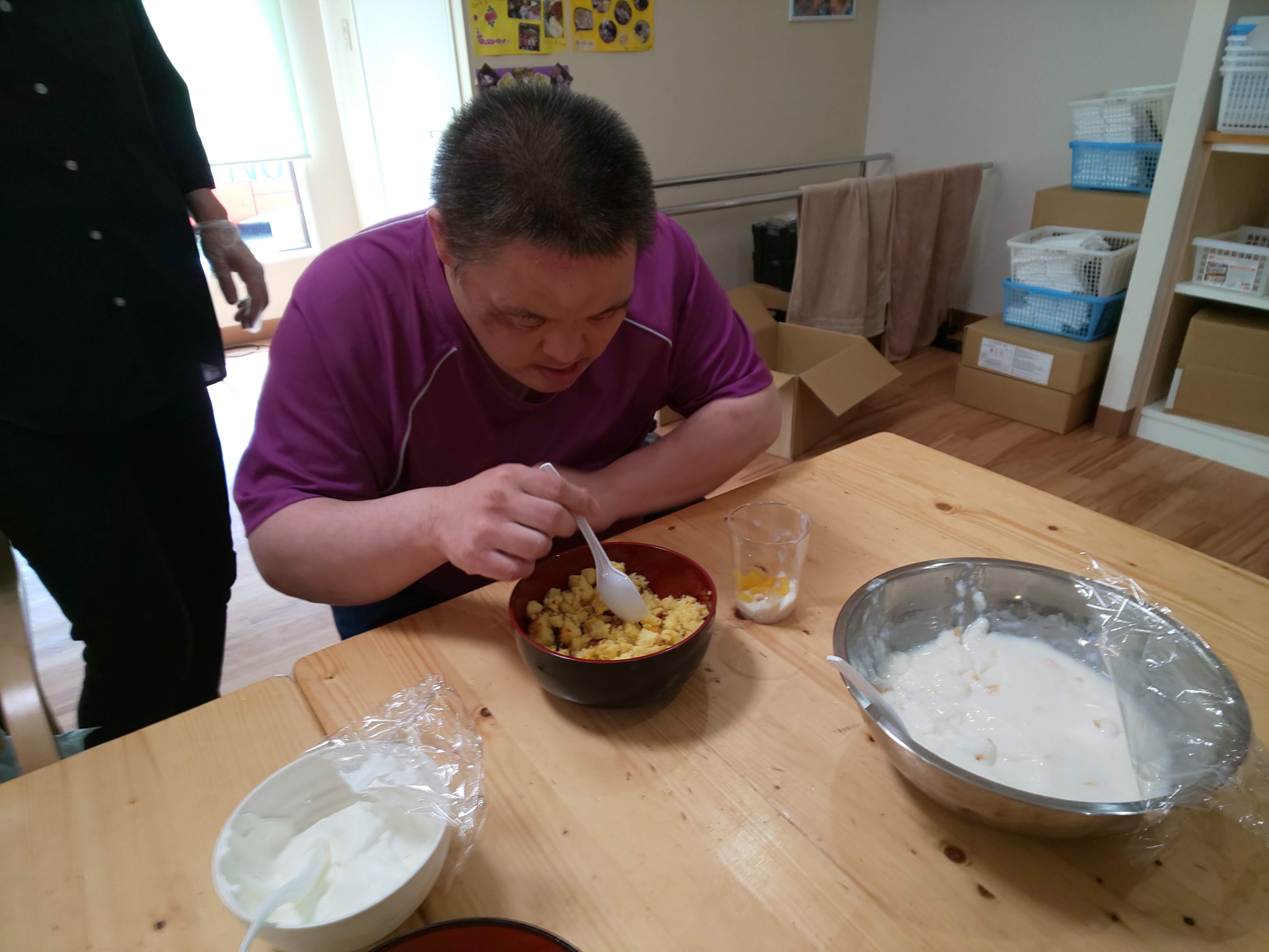 続いてパフェの具材となるフルーツやカステラをカットしていき、生クリームも作ります。